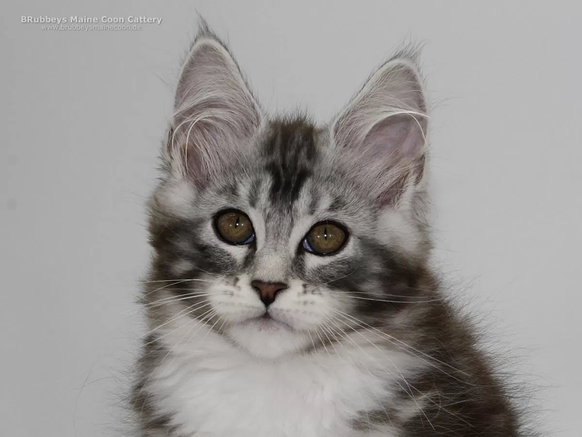 Der typvolle Maine Coon Kater BRubbeys Wallace besticht durch seine schöne klare Zeichung. Er entspricht eher dem alten Maine Coon Typ, kräftige breite Schnute, gutes Kinn. Die Ohren etwas kleiner aber gut gegesetzt. Er ist aufgeweckt und nicht ängstlich. Auf die weitere Entwicklung von Wallace bin ich sehr gespannt.