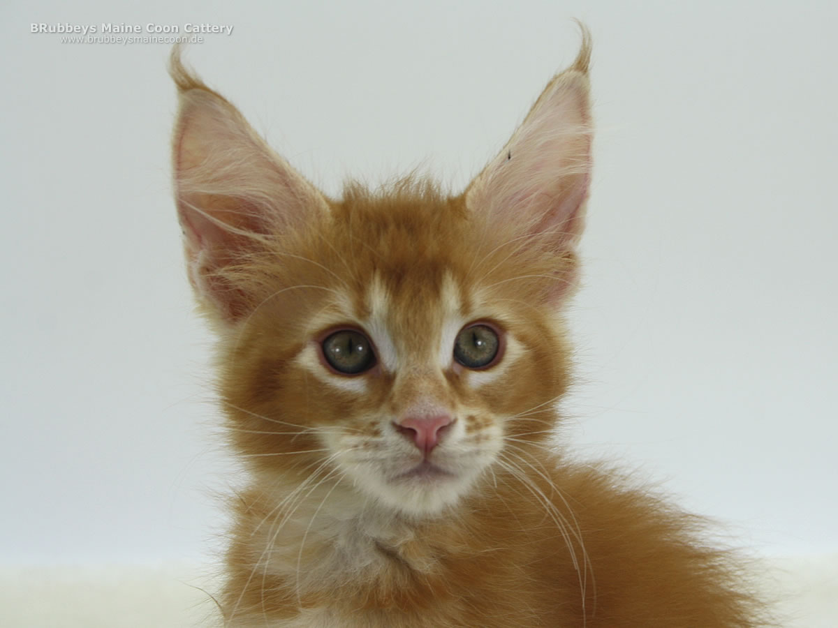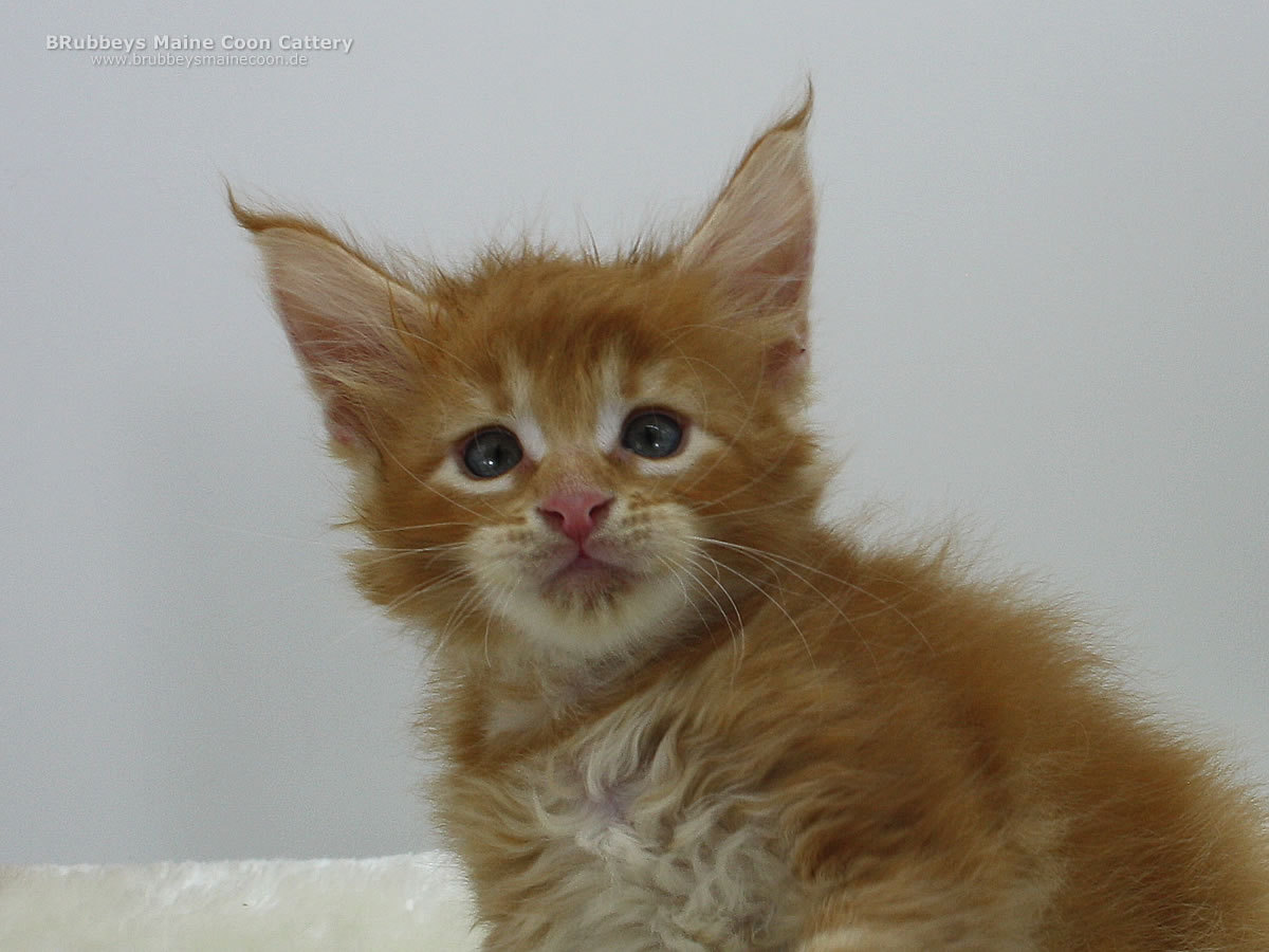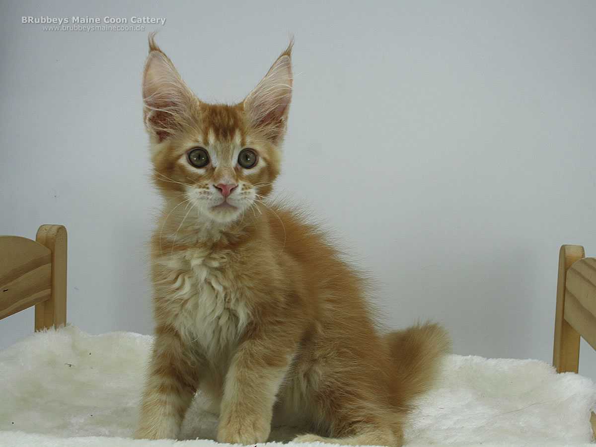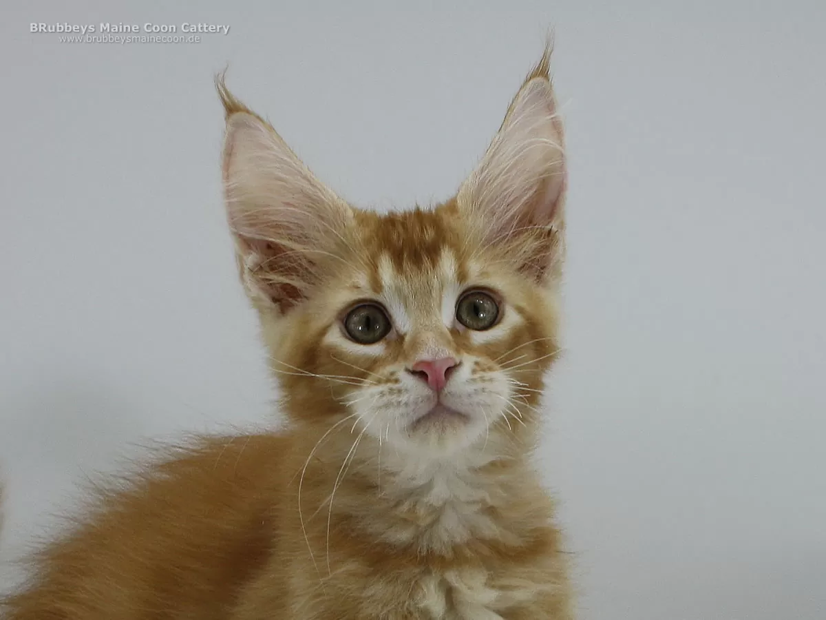 05.10.2025 – BRubbeys Yuri hat wohl bei der Vergabe der Ohren zweimal HIER gerufen. Seine großen Ohren stechen in dem Wurf schon heraus. Aber er erinnert mich sehr an seine Oma Ana – die als Kitten auch so riesige Ohren hatte. Da muss der schöne Junge noch ein bisschen hineinwachsen. Yuri steht auf hohen Beinen und ist eher lang und schlank. Er entspricht eher dem halbmodernen Maine Coon Typ. Ich bin gespannt, wo seine Reise mal hingeht. Er steht auf kräftigen Beinen, also wird er sicher auch mal groß. Sein rotes Ticked finde ich besonders schön.