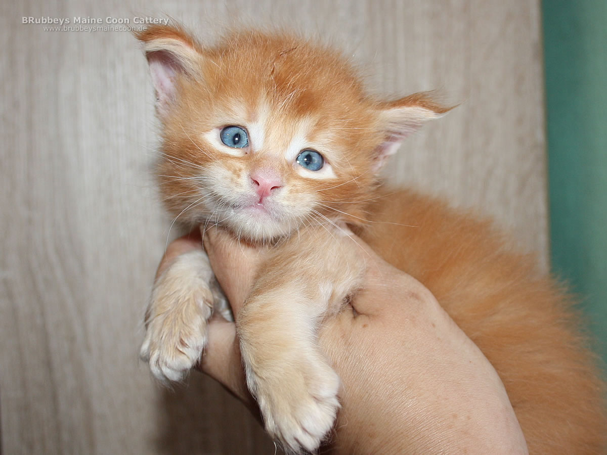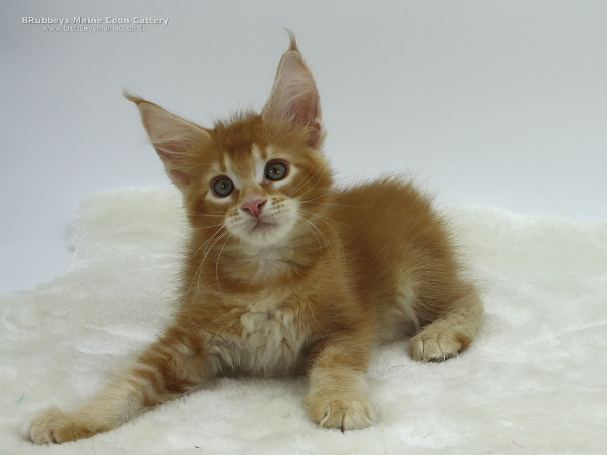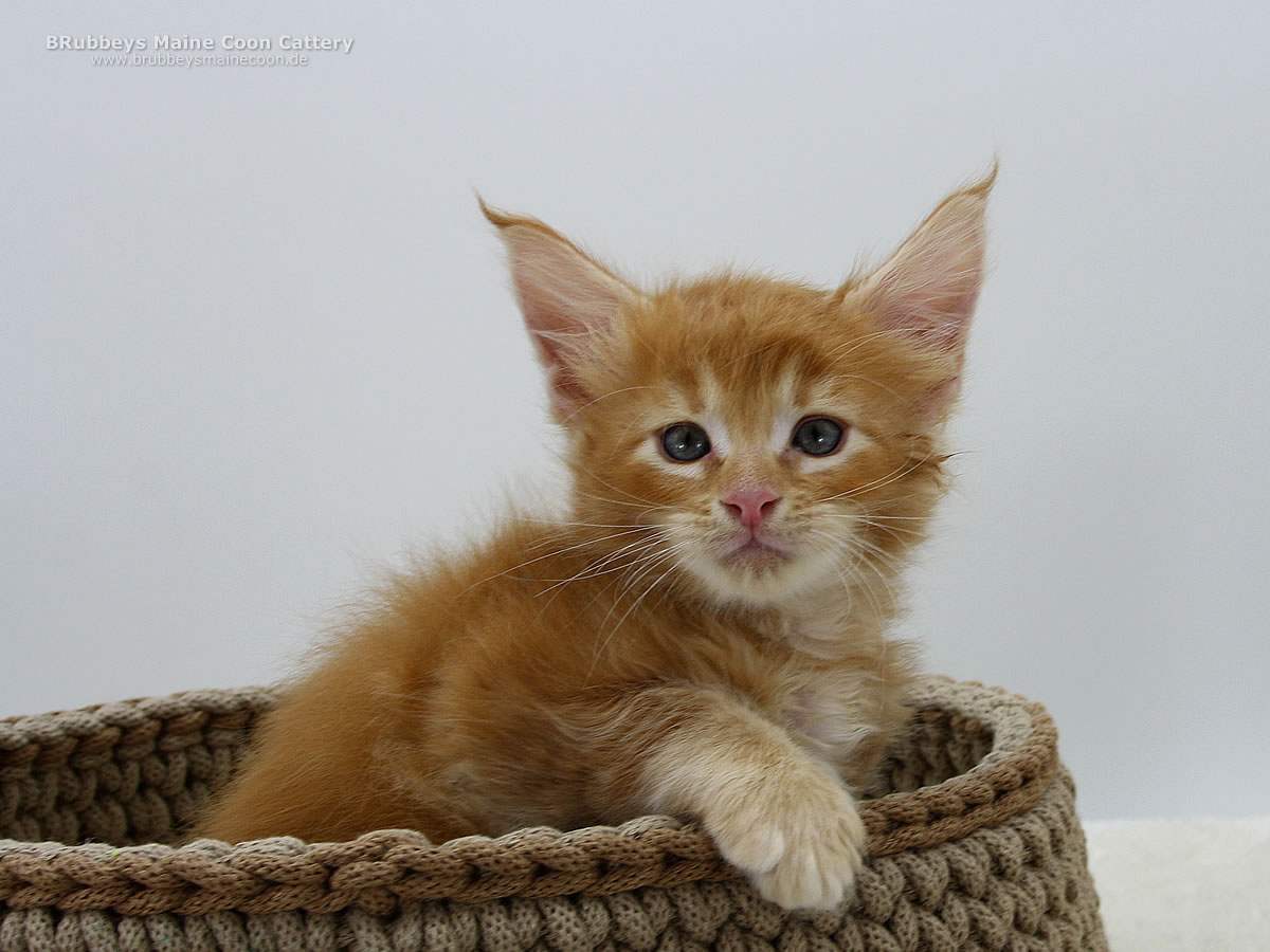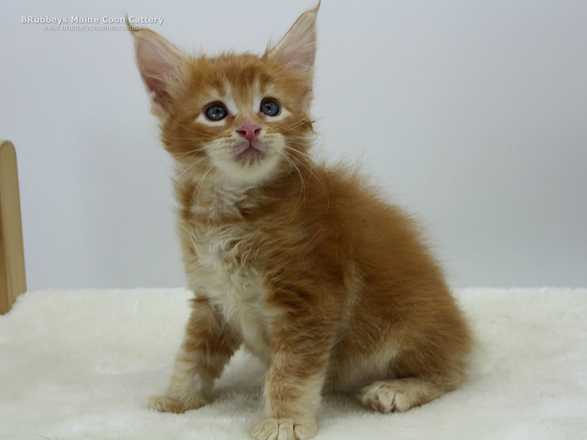 05.10.2025 – BRubbeys Yuri hat wohl bei der Vergabe der Ohren zweimal HIER gerufen. Seine großen Ohren stechen in dem Wurf schon heraus. Aber er erinnert mich sehr an seine Oma Ana – die als Kitten auch so riesige Ohren hatte. Da muss der schöne Junge noch ein bisschen hineinwachsen. Yuri steht auf hohen Beinen und ist eher lang und schlank. Er entspricht eher dem halbmodernen Maine Coon Typ. Ich bin gespannt, wo seine Reise mal hingeht. Er steht auf kräftigen Beinen, also wird er sicher auch mal groß. Sein rotes Ticked finde ich besonders schön.